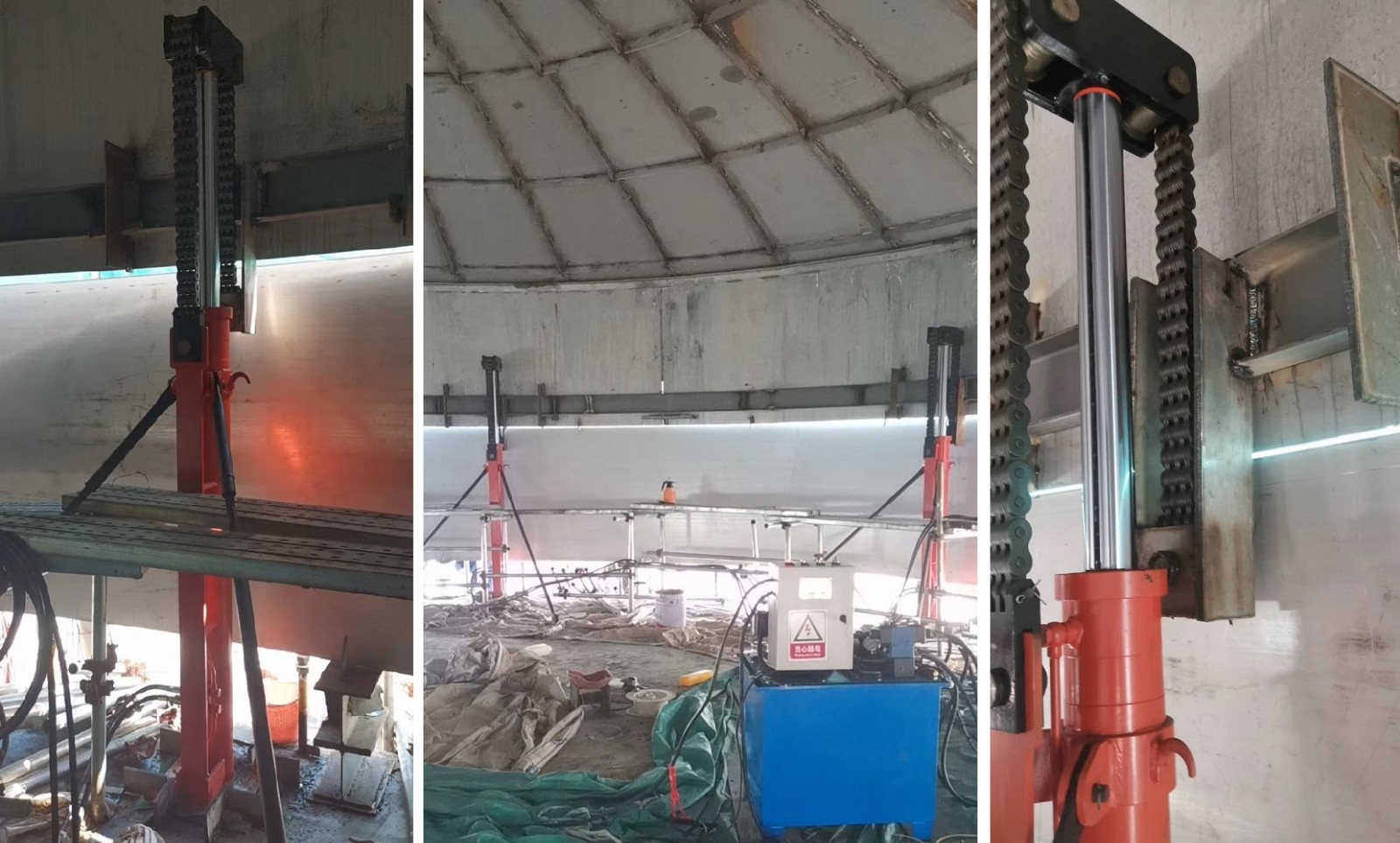 4. The equipment is well-adapted. As long as the number of hydraulic hoists is increased or decreased, the whole set of equipment can be applied to the inverted hydraulic lifting construction of large storage tanks with different volumes ranging from several thousand cubic meters to tens of thousands cubic meters.